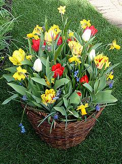 Onze mand is gevuld met meer dan 100 bloembollen van verschillende soorten, zoals Cheerfulness, Early Sunlight, Concerto, Tarda en meer. Daarnaast zullen er ook langbloeiende viooltjes bovenop de mand worden geplaatst. Het resultaat is een kleurrijke en vrolijke bollenmand waar je van oktober tot juni van kunt genieten.